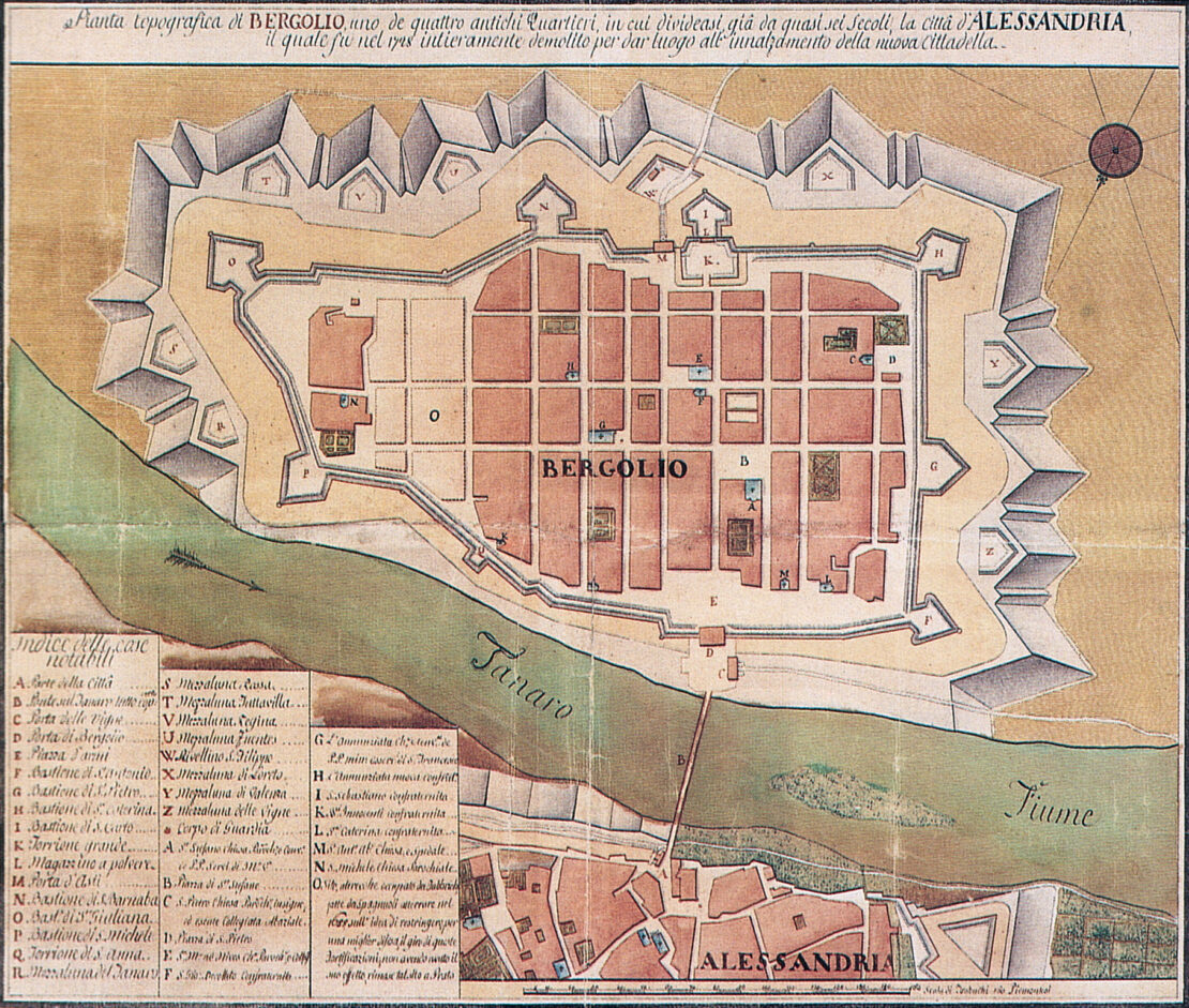 E appunto in quei tempi della fondazione di Alessandria che gli abitanti di Bergoglio, trovando scomoda la posizione del loro villaggio vicino alle colline, e invece più sicura quella difesa vicino alla nuova città, cominciarono a demolire quasi tutte le loro case e a trasportare le loro famiglie, suppellettili e bestiame, chi nella nuova città, che pur essi avevano costruita, e chi invece sulla sinistra del Tanaro, fuori di Alessandria, riedificando così un nuovo borgo al quale rinnovarono il nome di Bergoglio. Questo era congiunto alla città con un ponte di legno in vicinanza della «Porta delle Vigne» sulla strada per Valenza e colline (in seguito di Valle San Bartolomeo).